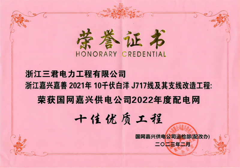 近日,本公司建設(shè)的浙江嘉興嘉善2021年10千伏白洋J717線及其支線改造工程,榮獲國網(wǎng)嘉興供電公司2022年度配電網(wǎng)十佳優(yōu)質(zhì)工程證書。