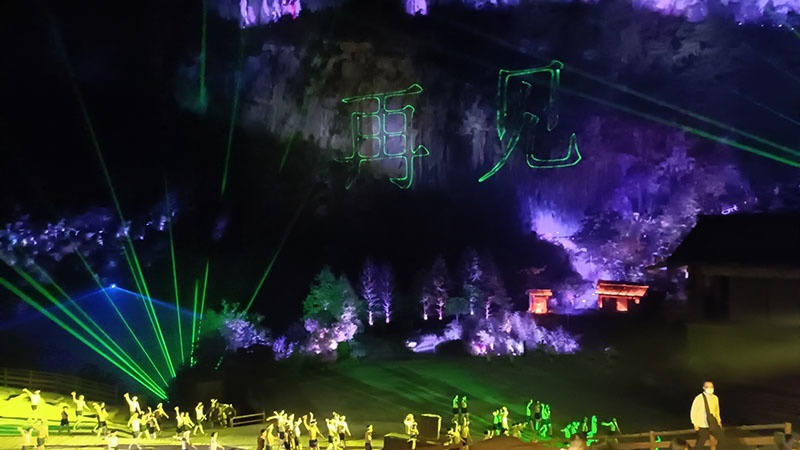 在朦朧細(xì)雨中夜幕降臨,我們欣賞了著名的實(shí)景歌會《印象武隆》,以瀕臨消失的“號子”為主要內(nèi)容,這場大型山水實(shí)景演出讓我們親身體驗(yàn)壯美的自然景觀和巴蜀大地獨(dú)特的風(fēng)土人情。