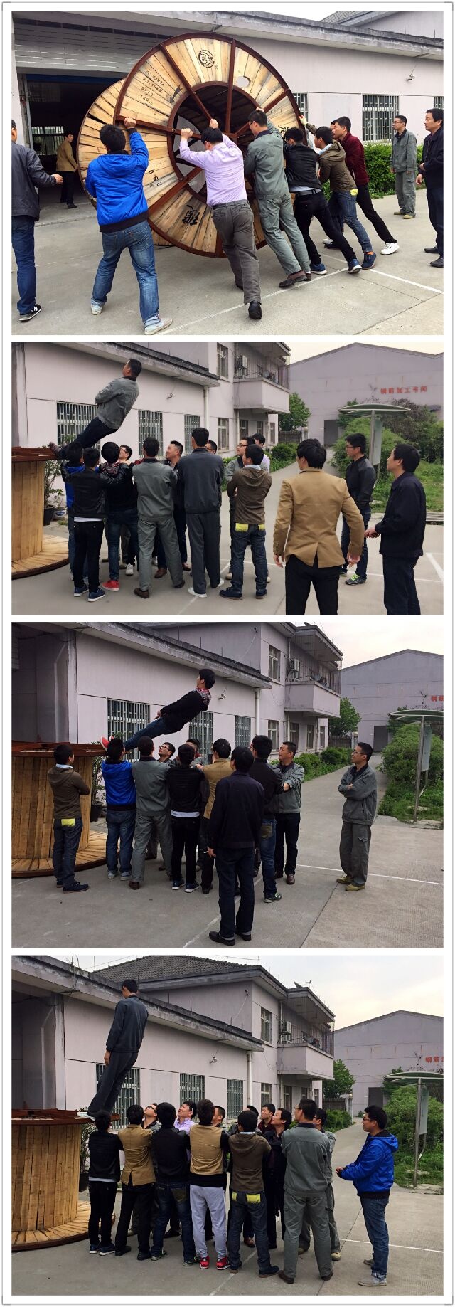 場地就在工程部的空地上,道具就是一個現(xiàn)成的大電纜盤,在簡單的講解過游戲規(guī)則后,同事們搭起一張“人床”,周總一馬當(dāng)先筆直的從1.8M的電纜盤上向后倒下,率先做了一個標(biāo)準(zhǔn)的示范,此時我們可愛的三君同事們臉上都洋溢著躍躍欲試的歡喜,等周總做完,大家一個個按順序跟上、不間斷的完成了這項游戲。